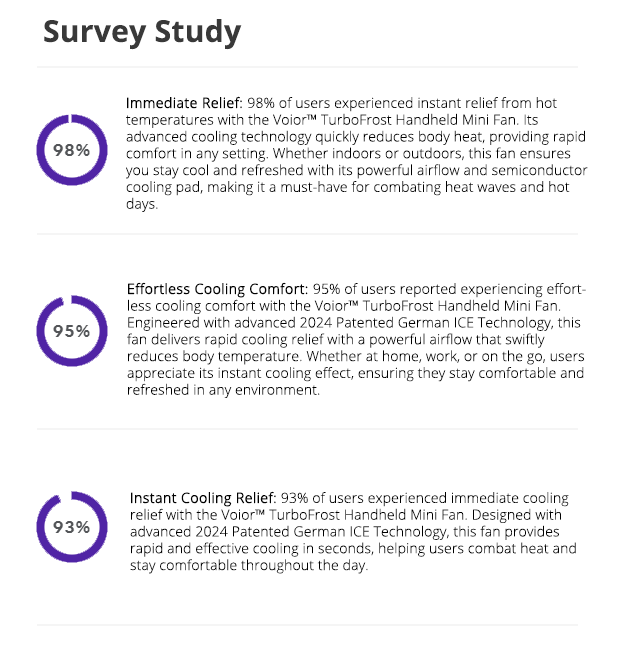 The Voior™ TurboFrost Handheld Mini Fan has been rigorously tested by leading experts in cooling technology. Each component has been meticulously analyzed to ensure it meets the highest standards of safety and effectiveness.